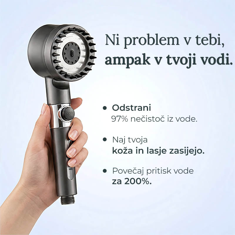 Vsak tuš vas izpostavi težkim kovinam, trdim mineralom in skritim nečistočam, ki sčasoma tiho poškodujejo lase in kožo.